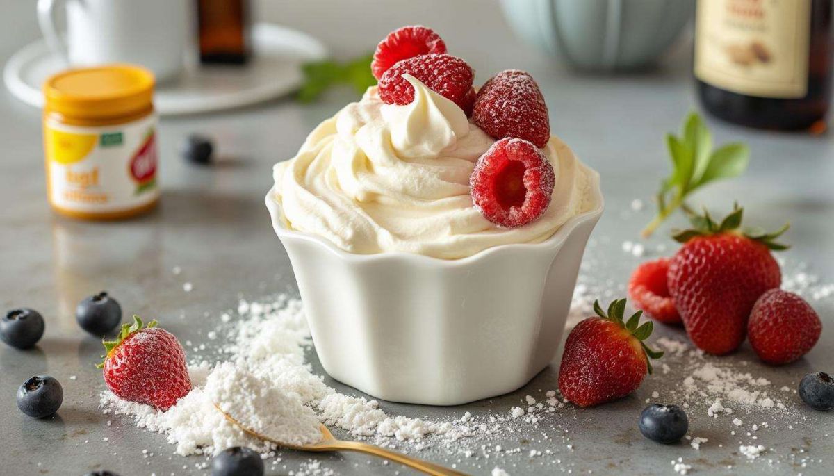Après quelques minutes de foisonnement, la crème épaissit et les traces que le fouet laisse deviennent de plus en plus visibles. C’est le moment d’ajouter le sucre glace et l’extrait de vanille. Pourquoi attendre autant ? Ajouter le sucre trop tôt risquerait d’alourdir la crème, The avantage du sucre glace réside dans sa rapidité à se dissoudre, offrant une texture douce sans grains. Pensez à tamiser le sucre avant de l’incorporer pour éviter tout grumeau ; cela garantira une chantilly parfaitement lisse.