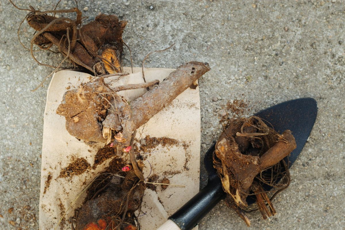 - Soulevez la souche de la plante avec précaution, en conservant un maximum de racines. Si les racines sont très enchevêtrées, retirez délicatement la terre.