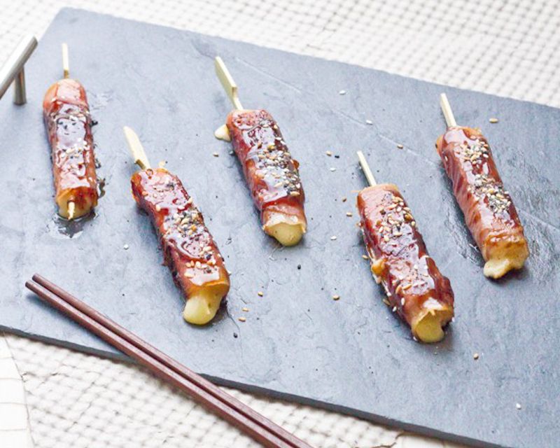 2. **Montage des brochettes** : Découpez le Cantal en bâtonnets et enroulez-les de jambon cru. Laissez mariner les brochettes 25 minutes dans la sauce yakitori.
