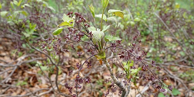 Ses feuilles, atteignant 30 cm de long, sont composées de 3 à 5 folioles ovales, finement lobées et dentées. Au printemps, lorsque les nouvelles feuilles apparaissent, des fleurs étoilées de couleur brun pourpré se forment en grappes pendantes, suivies de fruits en follicules jaunâtres.