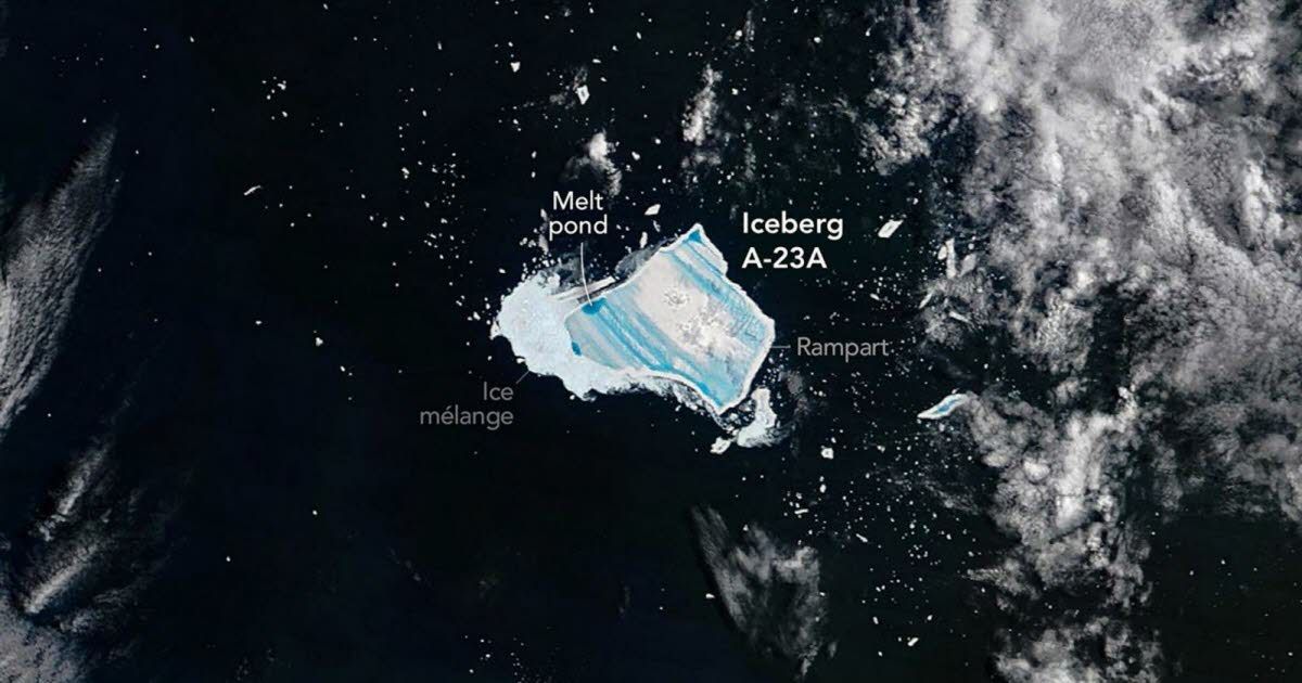 A23a s'est détaché de la plateforme de Filchner-Ronne en 1986, mais il n'a commencé à dériver qu'en 2020. Sa nouvelle couleur, révélatrice de séracs en décomposition, inquiète les climatologues : il pourrait imploser avant l'été austral de 2026, augmentant ainsi les inquiétudes sur la situation du climat, rapportent des médias tels que Presse-Citron.